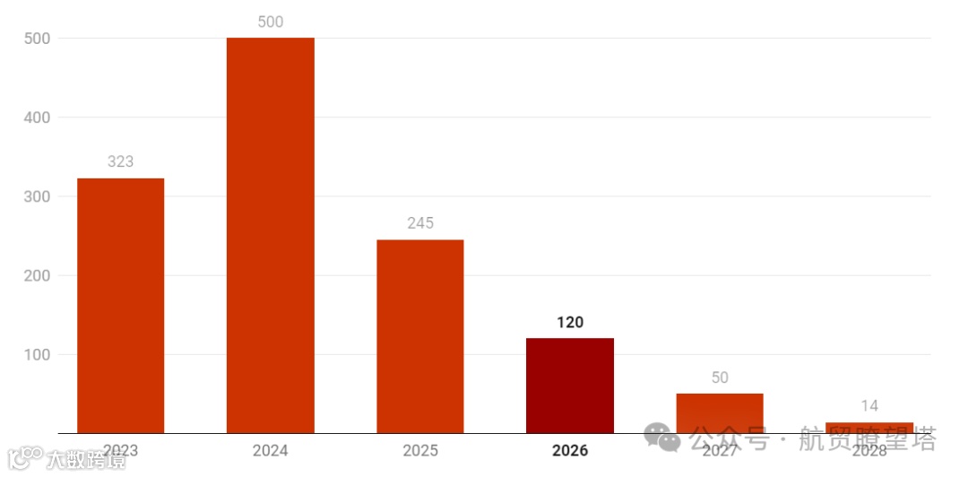 截至2024年5月1日的集装箱船舶交付数量以及此后计划交付的新船数量