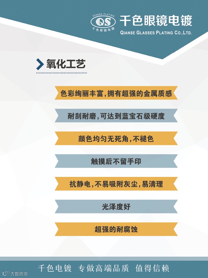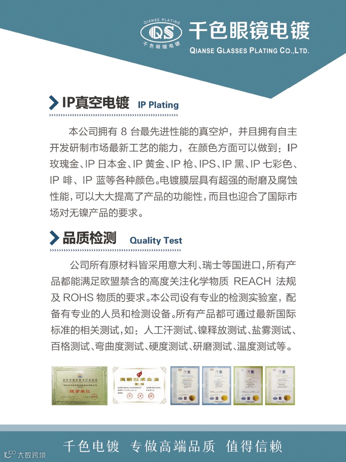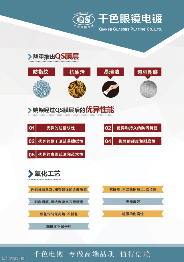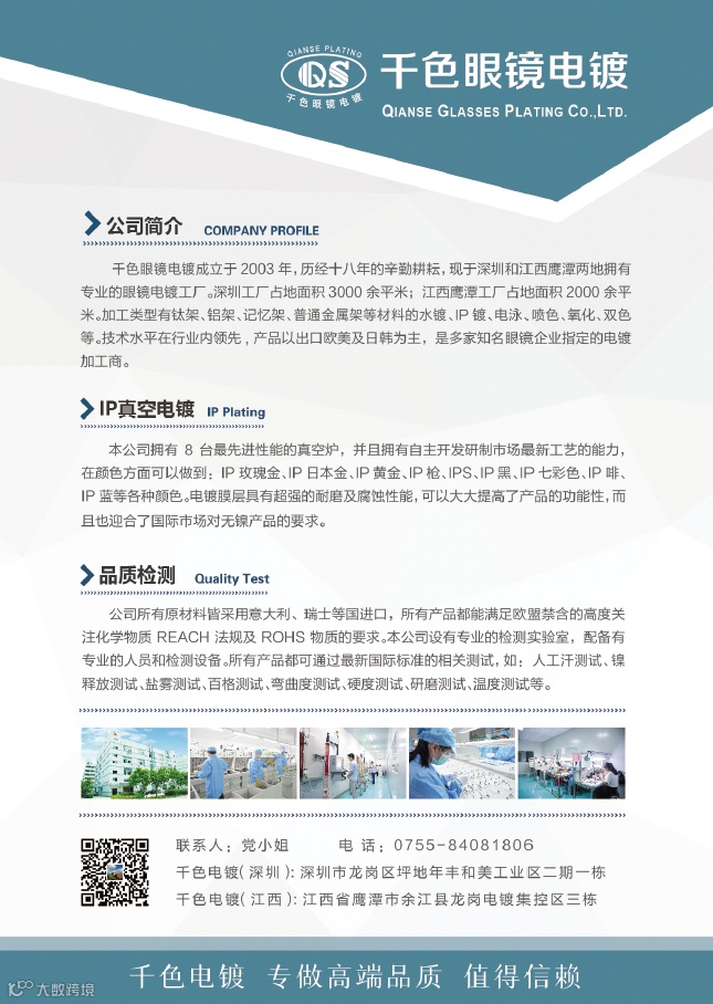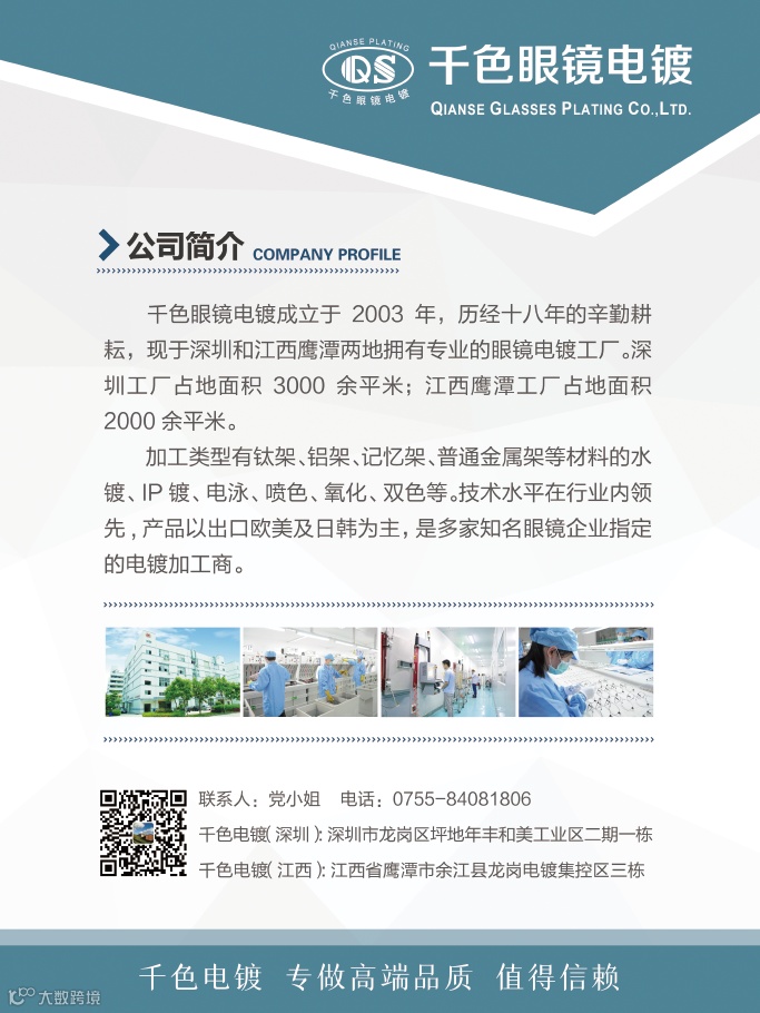 深圳市方元千色眼镜科技开发有限公司是深圳市眼镜行业协会的会员单位,是深圳有名的眼镜电镀加工商,加工类型有钛架、铝架、记忆架、普通金属架等材料的水镀、IP镀、电泳、喷色、氧化、双色等,技术水平在行业内领先。欢迎您5月6——8日来到上海眼镜展3号馆深圳展区3U16了解眼镜电镀。