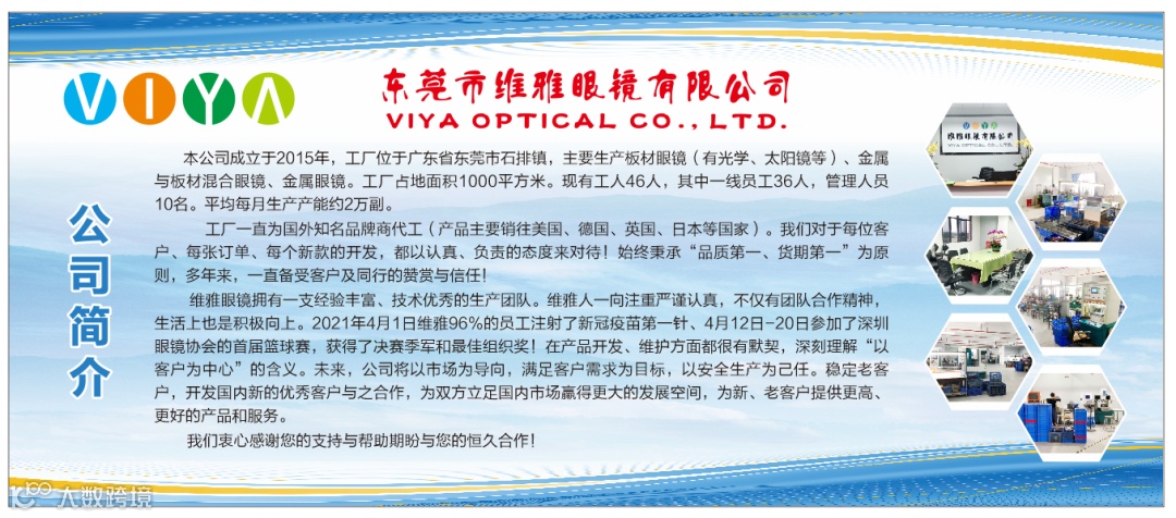 东莞市维雅眼镜有限公司是深圳市眼镜行业协会的会员单位,主要生产板材眼镜(包括光学、太阳镜等),是国外知名品牌商代工企业,在生产方面,公司始终秉承“品质第一、货期第一”的原则,今年5月,维雅眼镜会在上海展与大家见面,期盼各位前来的参观与合作。