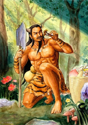 传说太古时候,天地不分,整个宇宙像个大鸡蛋,里面混沌一团,漆黑一片,分不清上下左右,东南西北。但鸡蛋中孕育着一个伟大的英雄,这就是开天辟地的盘古。盘古在鸡蛋中足足孕育了一万八千年,终于从沉睡中醒来了。他睁开眼睛,只觉得黑糊糊的一片,浑身酷热难当,简直透不过气来。他想站起来,但鸡蛋壳紧紧地包着他的身体,连舒展一下手脚也办不到。