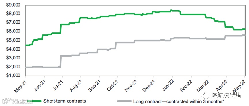 再次,船公司利用长期合同运力锁定高运价应对运价下降。由于承运人高管预计即期运费率将在2022年下半年下降,部分承运人已经通过长期合同锁定高运价水平,以确保今年全年的盈利能力。根据运价基准平台Xeneta数据,今年以来,尽管亚洲—欧洲航线短期合同的集装箱运费率下降,但在过去三个月内签订的长期合同运费率基本保持稳定。如马士基船公司不断增加对长期客户的运力分配,同时减少货运代理的运力份额,2022年长期合同运力所覆盖的比例从2020年的50%、2021年的65%上升到70%。