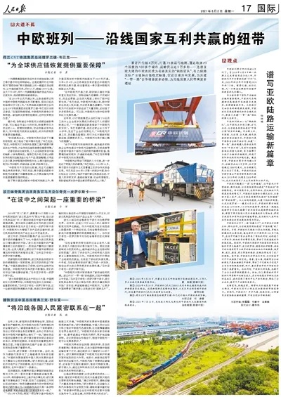 2021年6月初,南京—荷兰蒂尔堡中欧班列线路正式开通。“中欧班列的发展将中国速度体现得淋漓尽致。”舒尔策感慨道,中国人民付出巨大努力推动中欧班列迅速发展,这也鼓舞着德铁在世界各地的员工。“中欧班列的参与者目标高度一致,都希望通过中欧班列更好、更多地运输货物。在这种团结合作推动下,相信中欧班列一定可以发展得更好。”