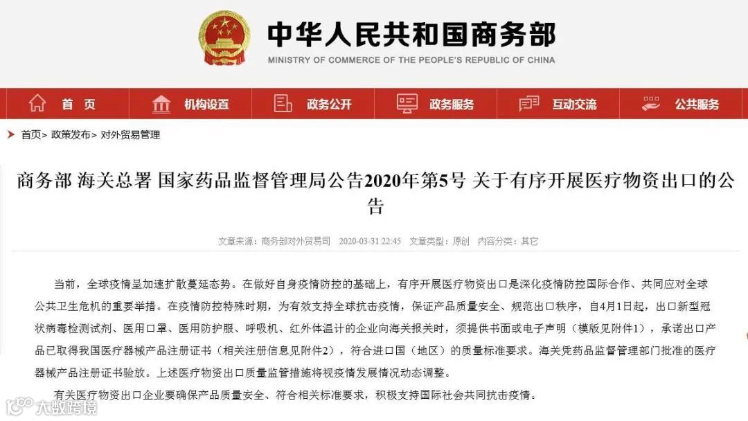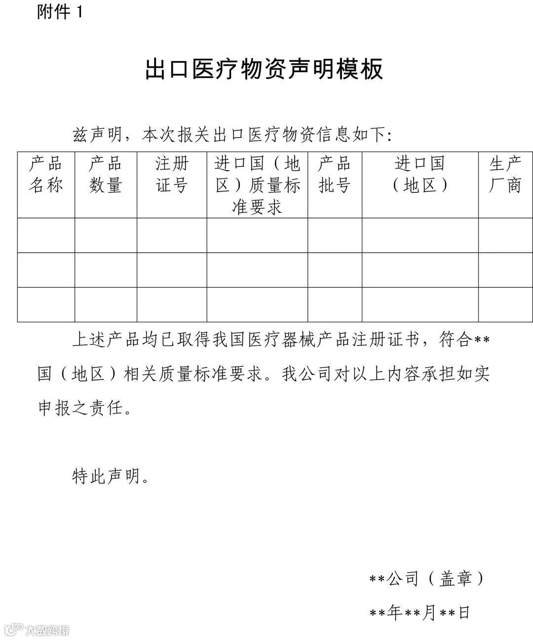 当前,全球疫情呈加速扩散蔓延态势。在做好自身疫情防控的基础上,有序开展医疗物资出口是深化疫情防控国际合作、共同应对全球公共卫生危机的重要举措。在疫情防控特殊时期,为有效支持全球抗击疫情,保证产品质量安全、规范出口秩序,自4月1日起,出口新型冠状病毒检测试剂、医用口罩、医用防护服、呼吸机、红外体温计的企业向海关报关时,须提供书面或电子声明(模版见附件1),承诺出口产品已取得我国医疗器械产品注册证书(相关注册信息见附件2),符合进口国(地区)的质量标准要求。海关凭药品监督管理部门批准的医疗器械产品注册证书验放。上述医疗物资出口质量监管措施将视疫情发展情况动态调整。