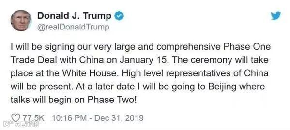 根据特朗普的推特,2020年1月15日他会在白宫和中方高层代表一同签署第一阶段协议。稍后他将前往北京,开始第二阶段协议的谈判。