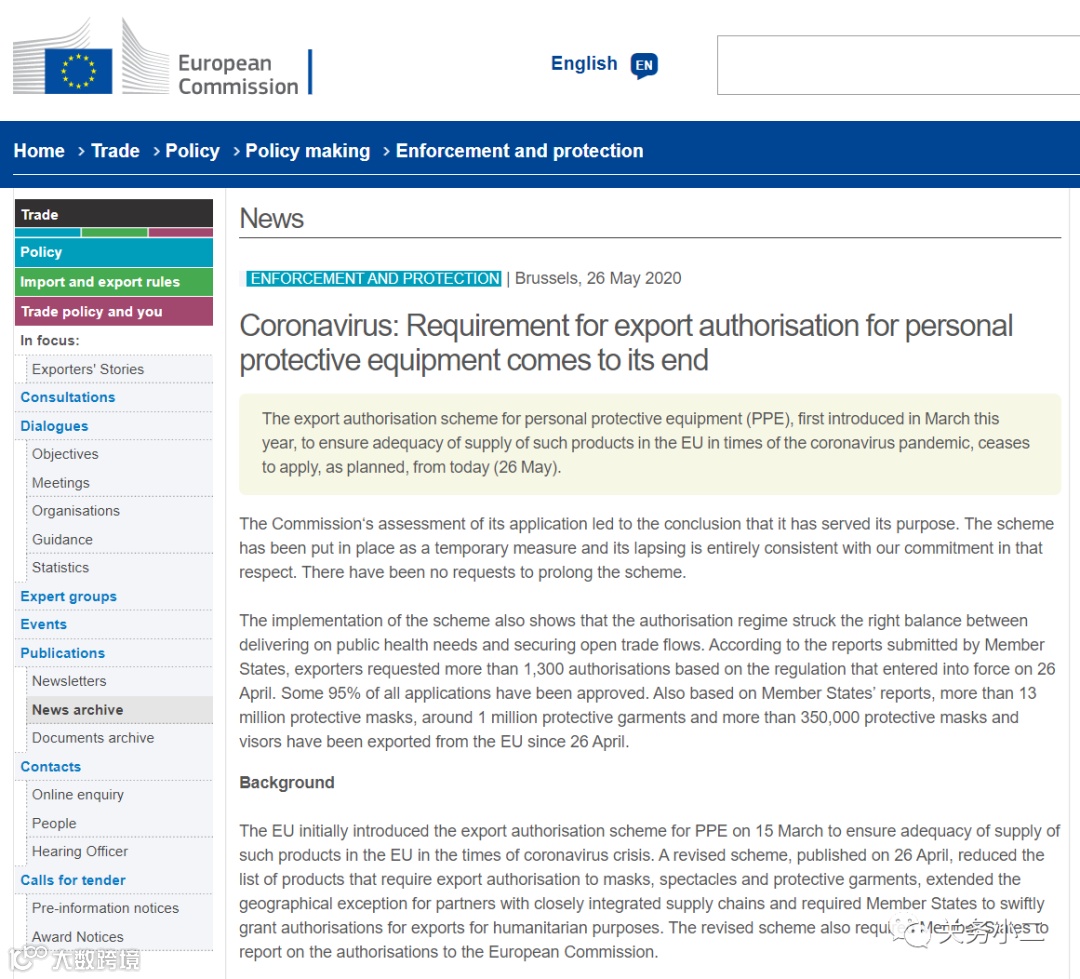 今年3月份,受疫情影响,欧盟为确保有充足的口罩等个人防护用品(PPE)供应,发布了相关出口禁令,2020年5月26日,欧盟正式取消对个人防护用品出口禁令。
