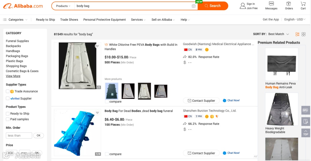 为了满足不断上升的丧葬用品需求,据阿里巴巴国际站介绍,一家扬州生产牙刷、浴帽等酒店用品的工厂正在更换新设备,即将转向投产丧葬用品,日产600到800件裹尸袋。