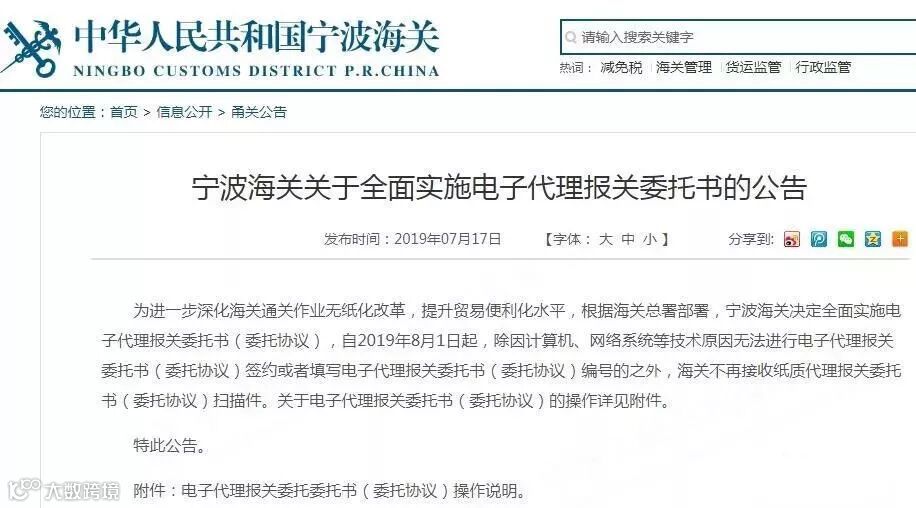 近日,各大海关关区发布通知,自2019年8月1日起,除因计算机、网络系统等技术原因无法进行电子代理报关委托书(委托协议)签约或者填写电子代理报关委托书(委托协议)编号的之外,海关不再接收纸质代理报关委托书(委托协议)扫描件。