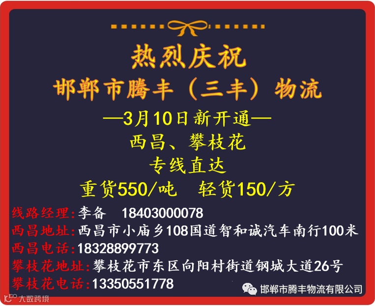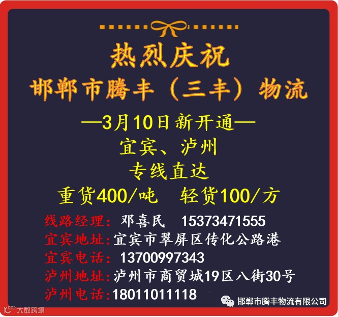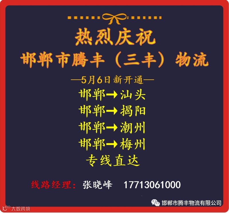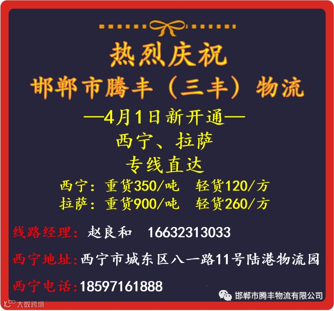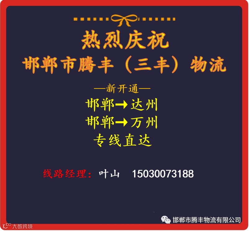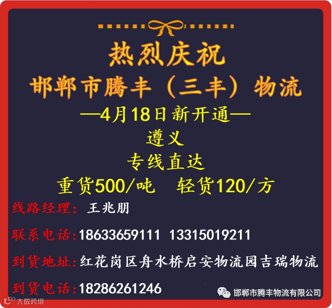 邯郸市腾丰物流有限公司是一家专业物流服务性企业。现已开通昆明、贵阳、保定、西宁、杭州、广州、西安、重庆、成都、郑州、银川、兰州、乌鲁木齐。公司自成立以来,始终为客户提供快速高效、便捷及时、安全可靠的服务。服务电话:03108161111