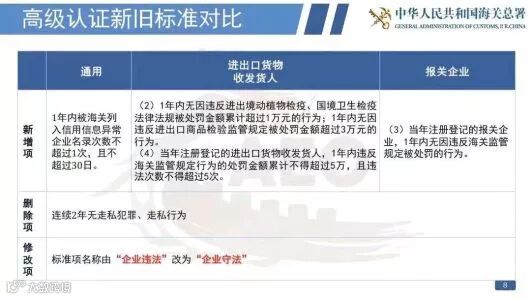 原标准中,所有赋分标准项均没有不达标(-2分)情形以及认证标准总分在95分(含本数)等要求得到了延续,此外,新认证标准还增加了内部控制、贸易安全两类标准中没有单一标准项基本达标(-1分)超过3项的情形,规范改进则被取消,此举也意味着,认证过程中企业不能借助规范改进达标。