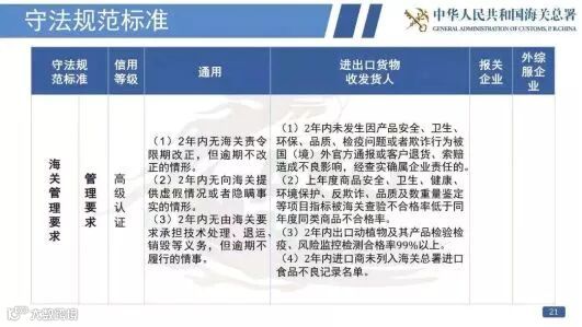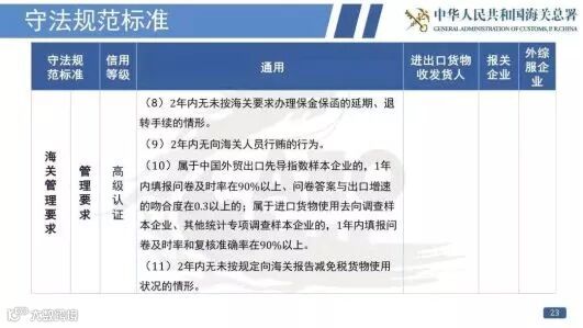 认证企业应当同时符合通用认证标准和与其实际情况相符的相应经营类别的单项认证标准。举个栗子,进出口货物收发货人要通过相应类别的认证,应当同时符合通用标准和单项标准中的进出口货物收发货人相应标准。