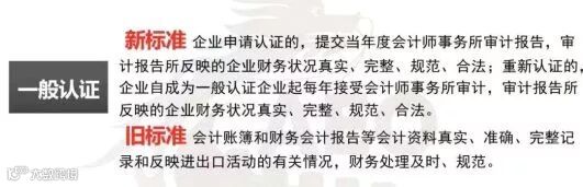 ★ 新标准在财务状况标准方面也作出了调整:一是新增了一般认证企业也需提交会计师事务所审计报告的要求;二是按照综合财务状况对企业进行考量,具体包括综合速动比率、现金流动负债比率、资产负债率、营业利润率、净资产收益率等财务状况。