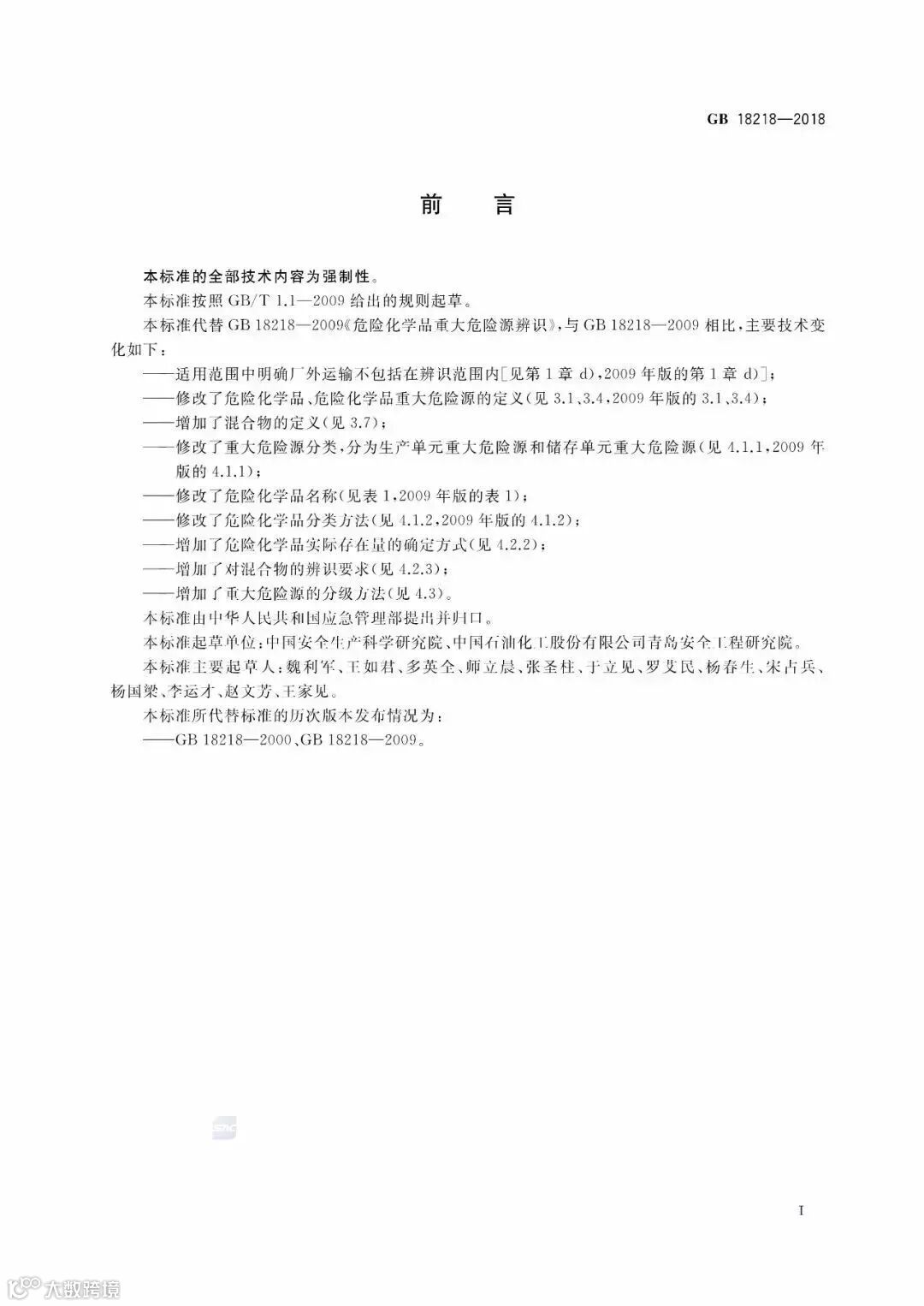 ☞2009年,国家安全监管总局将标准名称改为《危险化学品重大危险源辨识》(GB18218-2009)代替原标准。本次《重大危险源辨识》(GB18218-2018)是对2009版的一次修订。