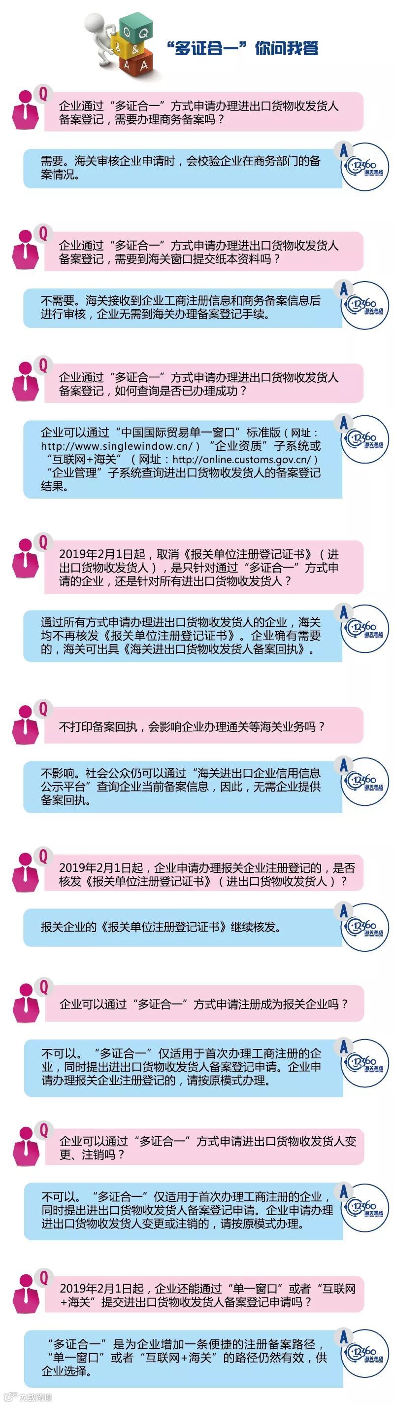 为进一步优化营商环境,落实《工商总局等十三部门关于推进全国统一“多证合一”改革的意见》(工商企注字〔2018〕31号),海关总署和市场监管总局决定将《报关单位注册登记证书》(进出口货物收发货人)纳入“多证合一”改革,于2019年2月1日起全面实施。企业办理工商注册登记时,可同时通过“多证合一”方式申请办理进出口货物收发货人备案登记,海关确认接收到企业工商注册信息和商务备案信息后即完成企业备案,企业无需再到海关办理备案登记手续。