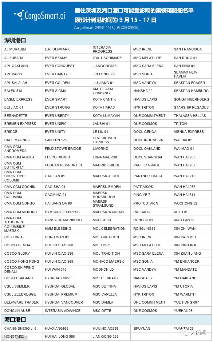根据大船期最新的跟踪数据显示,截至目前,已经有超过168艘集装箱船因为台风影响将面临严重的船期延误:这些船舶的原定预计到港时间为9月15-17日: