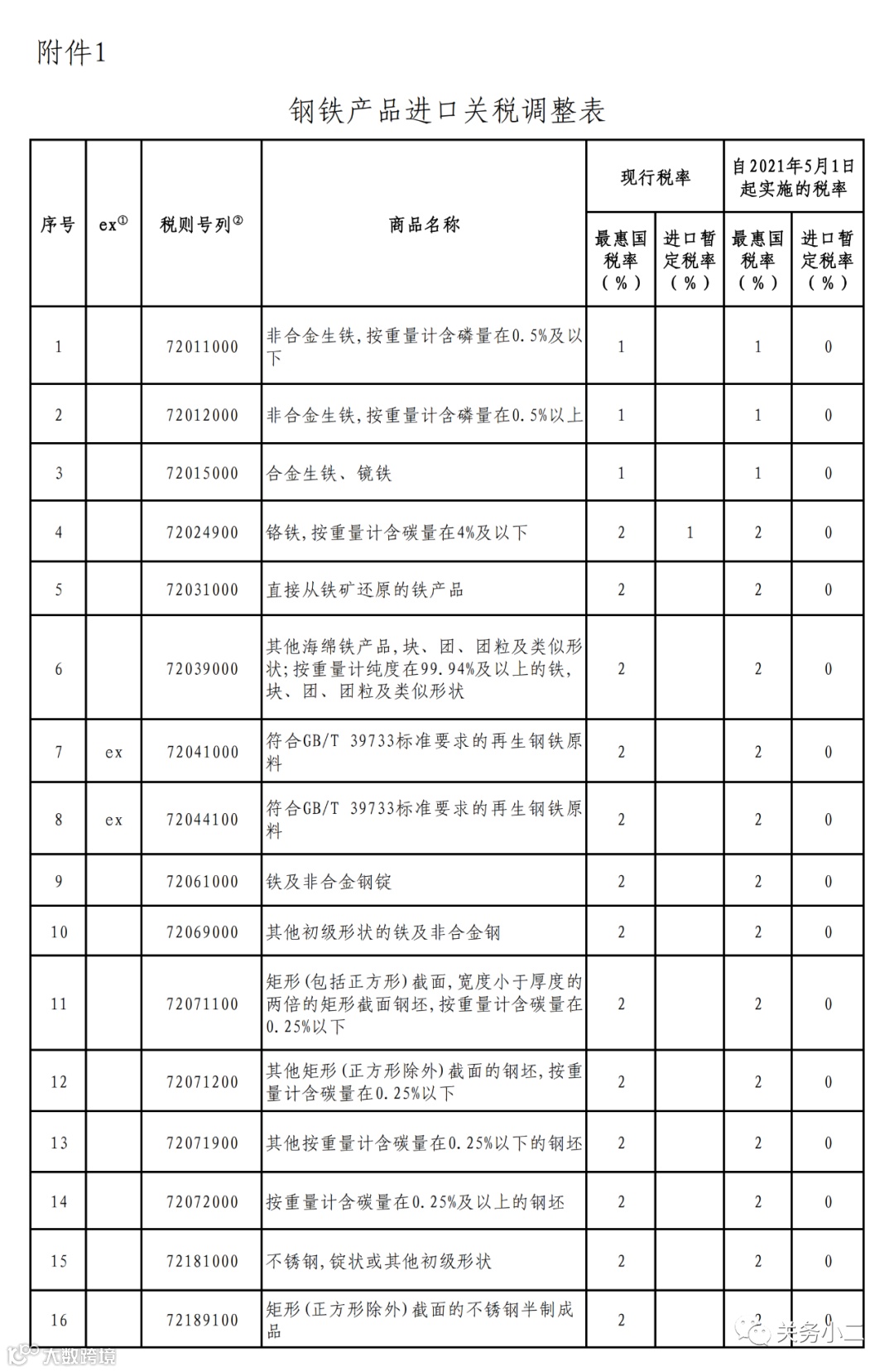 1、生铁、粗钢、再生钢铁原料、铬铁等产品实行零进口暂定税率;