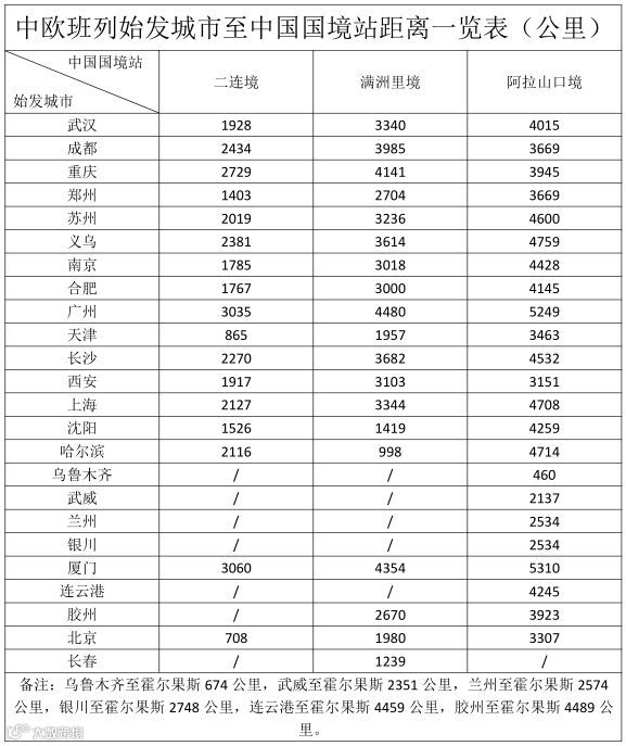 中欧班列始发城市至中国国境站距离一览表