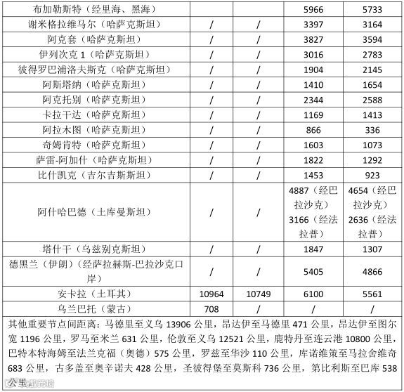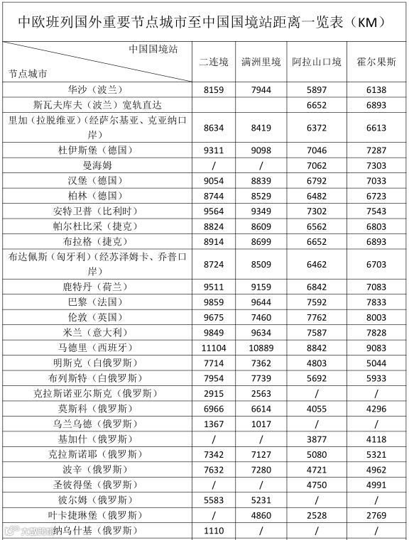 中欧班列国外重要节点城市至中国国境站距离一览表