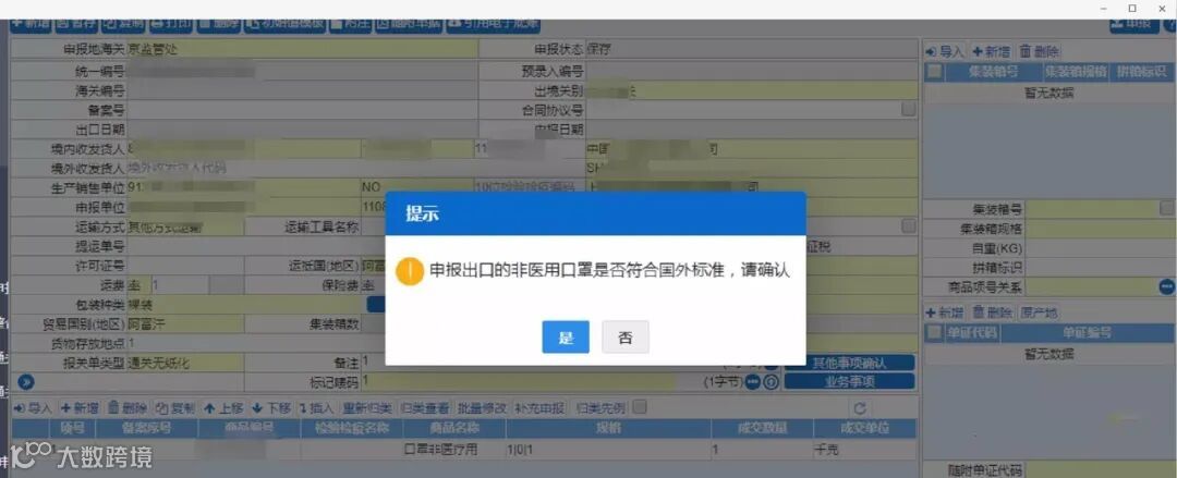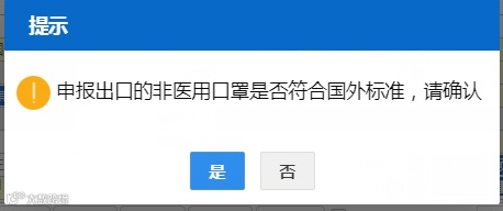 2. 新增提示“申报出口的非医用口罩是否符合国外标准,请确认”,并增加按钮“是”及“否”: