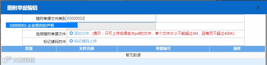 点击表头随附单据按钮,在随附单据文件类别字段选择“50000002-企业提供的声明”中上传电子文件)