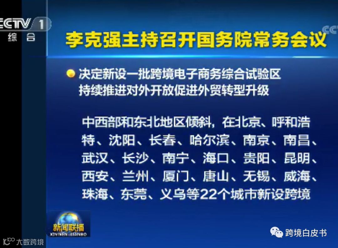 关于新设第三批跨境电商综合试验区的消息已经很久了,前几天《国务院办公厅转发商务部等部门关于扩大进口促进对外贸易平衡发展意见的通知》就提到,“加快复制推广跨境电子商务综合试验区成熟经验做法,研究扩大试点范围”。而在今天国务院会议决定新设一批跨境电商综合试验区,涉及22个城市。