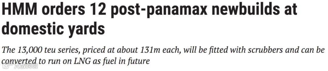 据劳氏日报近日报道,韩国班轮公司HMM与韩国大宇造船和韩国现代重工,签订了新造船合同,订造12艘13000TEU型船。这些新船一旦交付,HMM的运力将提升至近100万TEU。