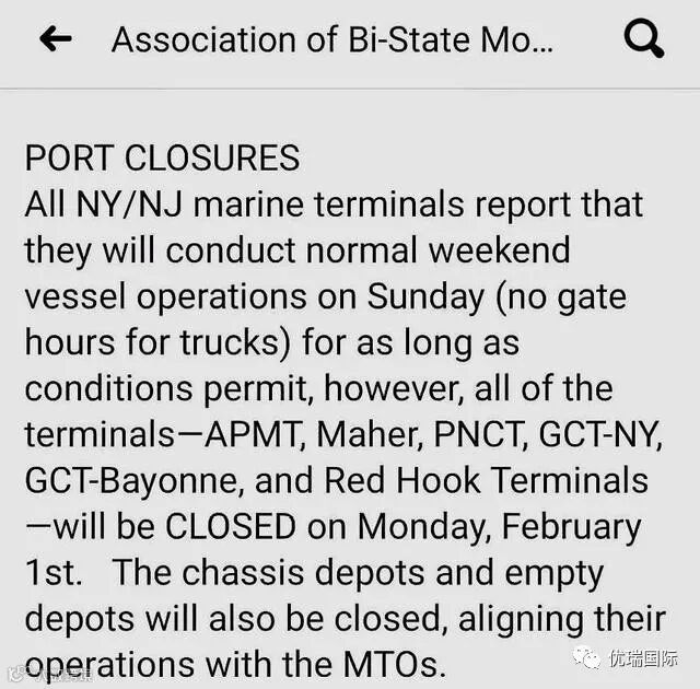 海运码头报告称,只要条件允许,将在周日进行正常的船舶操作,但卡车不允许入港,目前纽约所有的码头在2月1日周一关闭,包括APMT, Maher,PNCT, GCT-NY ,GCT-Bayonne和Red Hook码头。车架仓库和空仓库也将关闭,以便与MTOs保持一致。