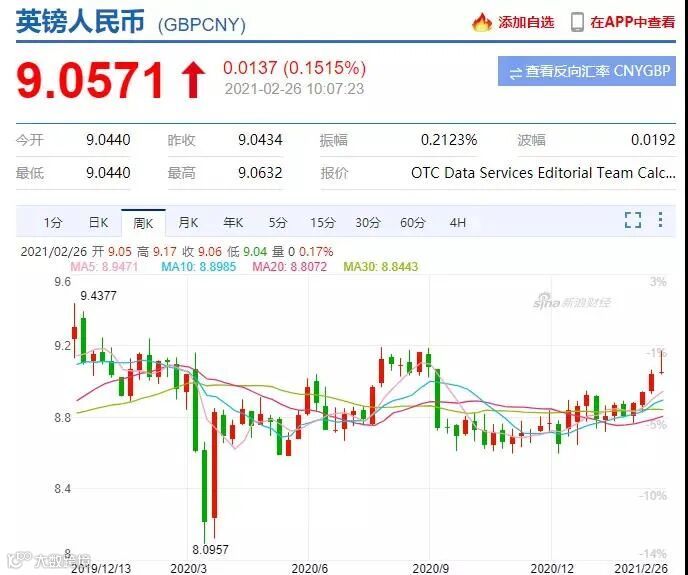英镑兑人民币汇率也涨破9.1,创下近三个月新高。