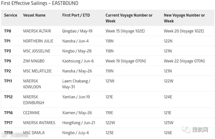在公告中,马士基发布了调整后的航次,其中包括10条跨太航线的相关航次,涉及青岛、宁波、盐田、南沙、厦门、香港等港口,该航次调整将从5月开始执行。
