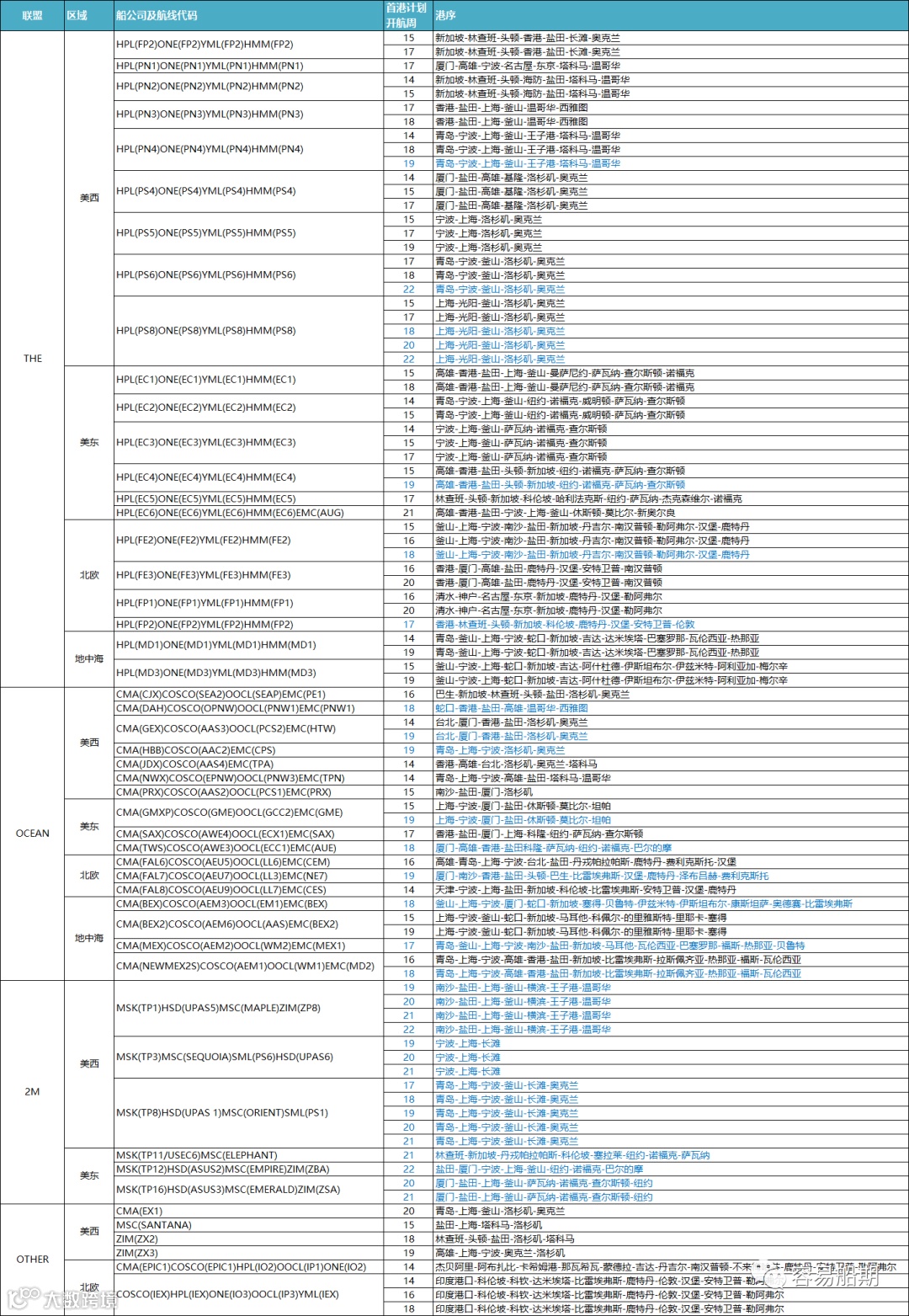 从联盟来看,THE联盟停航47个航次,海洋联盟21个航次,2M联盟16个航次,其他独立航线8个航次。