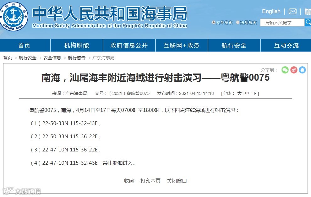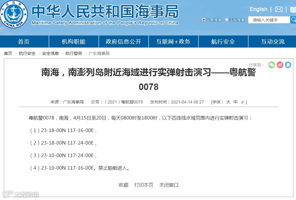 粤航警0075,南海,4月14日至17日每天0700时至1800时,以下四点连线海域进行射击演习: