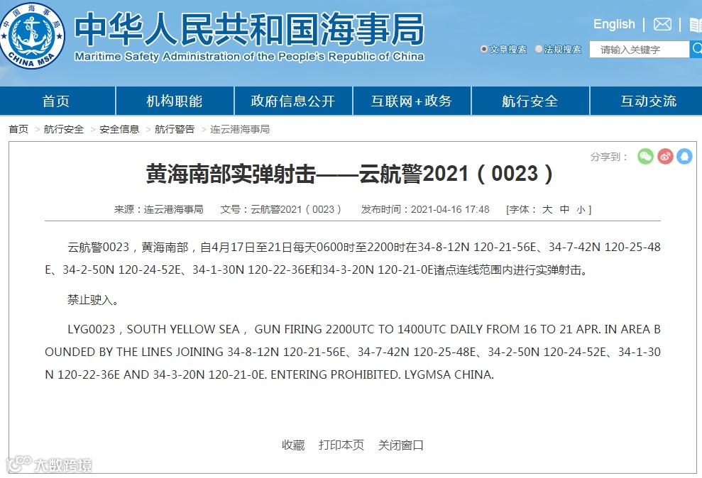 黄海 2021年4月15日0800时至1800时、4月17日0600时至1300时,在以下4点连线海域内进行军事活动: