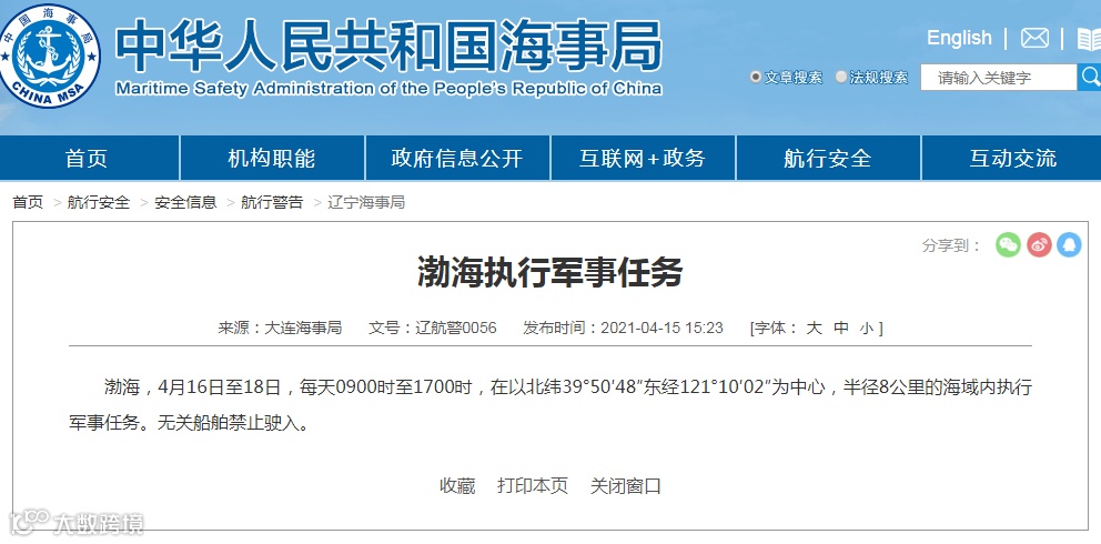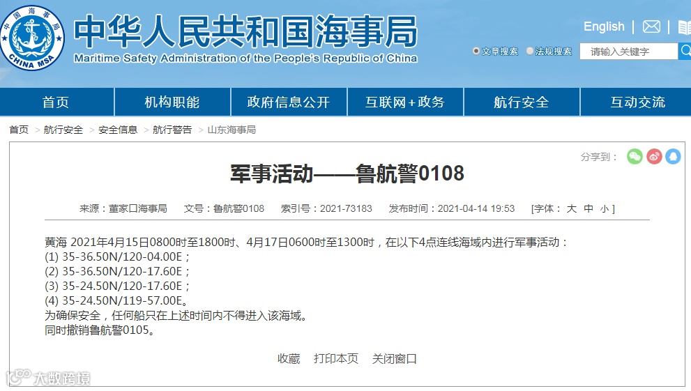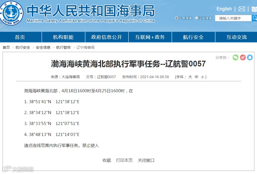 4月14日至4月25日期间,渤海、黄海、黄海,部分海域执行军事任务,禁止无关船舶驶入。