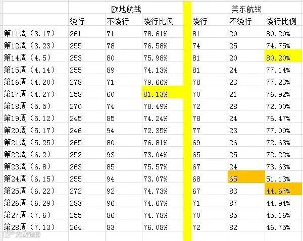 美东航线绕行航次72,非绕行航次82,绕行比例46.75%,美东航线数据出现异常,主要是非绕行航次大幅增多,因为走的巴拿马,巴拿马运河水位已经基本恢复正常。
