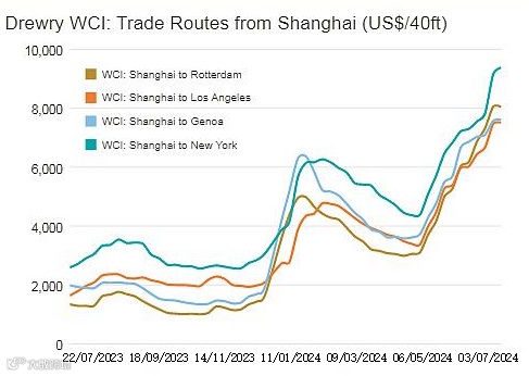 根据 Sea-Intelligence Maritime Analysis 的数据,7月亚洲至西海岸的总运力为 168 万标准箱,比 2023 年 7 月高出近 12%。承运商和承运商联盟已开始逐步开通从中国到洛杉矶长滩的每周七班航线。并推出或恢复了三条服务到太平洋西北地区(西雅图-塔科马和温哥华)。