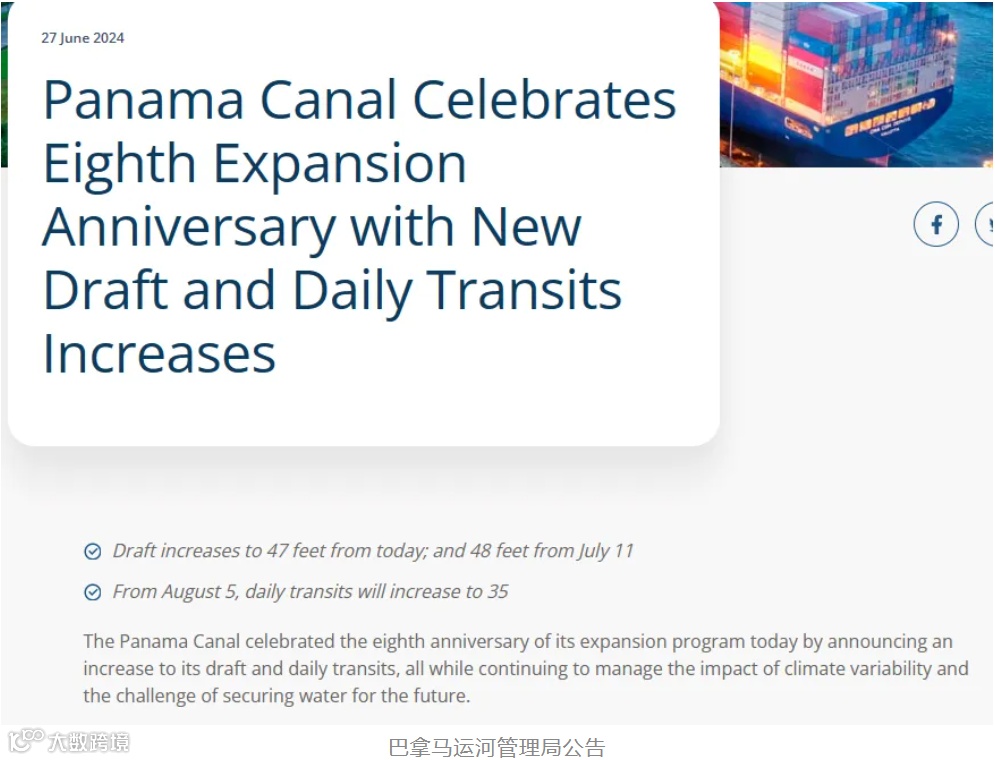 根据巴拿马运河管理局(ACP)的公告,自2024年8月5日起,新巴拿马船闸将增加1个新的预订时段,使巴拿马运河日船舶通行数量从目前的32艘增加至35艘,这意味着巴拿马运河的通航能力已基本恢复。