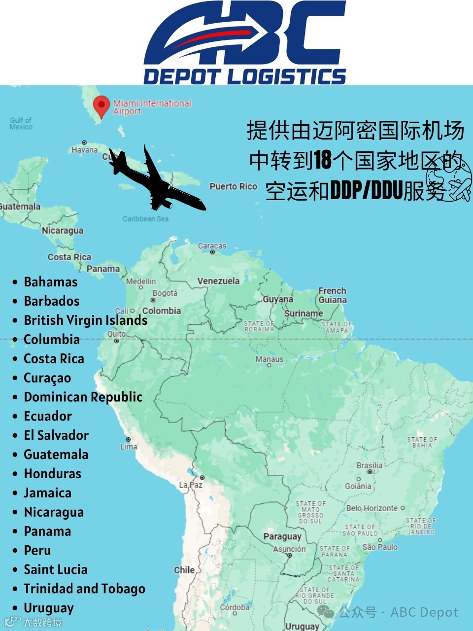 在全球化的时代,便捷高效的航空运输是连接世界的重要纽带。在此,我们ABC DEPOT LOGISITCS自豪地向您推出一项创新的空运服务——从美国迈阿密机场中转到18个国际地区的空运和DDP/DDU服务,包括:通往哥斯达黎加、库拉索、多米尼加共和国、厄瓜多尔、萨尔瓦多、危地马拉、洪都拉斯、牙买加、尼加拉瓜、巴拿马、秘鲁、圣卢西亚、特立尼达和多巴哥、乌拉圭等多个国家和地区。