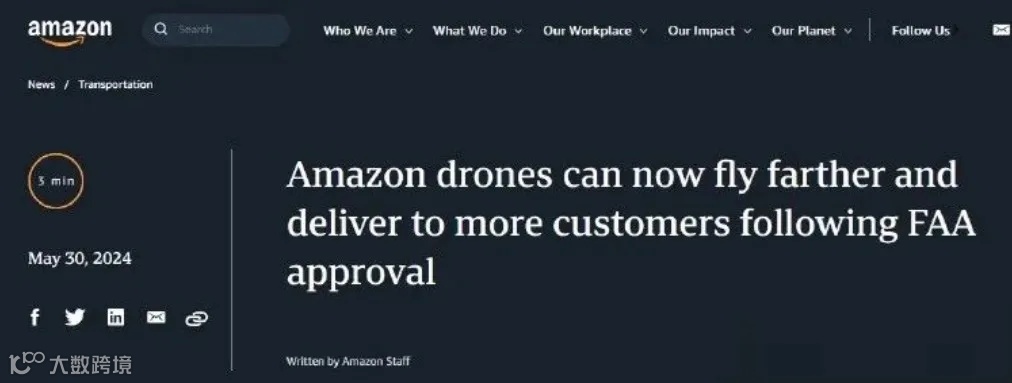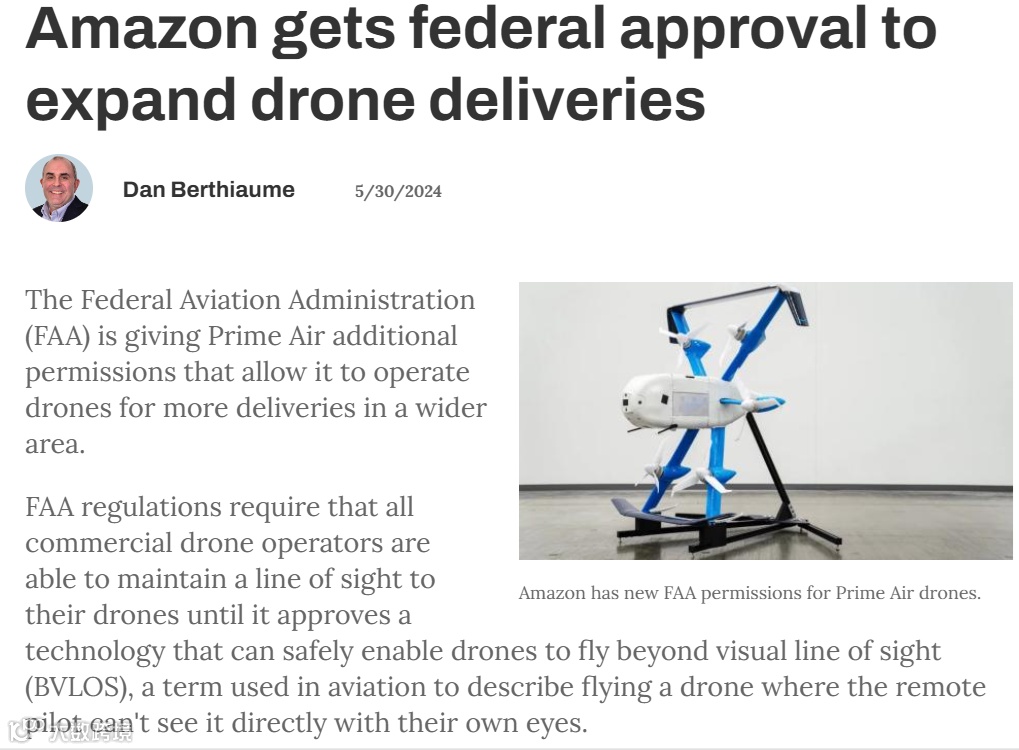 当地时间5月30日,科技巨头亚马逊及相关媒体宣布,美国联邦航空管理局(FAA)已批准亚马逊送货无人机的超视距飞行(BVLOS),亚马逊飞行员现在可以远程操作无人机,不局限于视野范围内,从而消除了阻碍其无人机长距离飞行的障碍,业务范围和送货规模也将得到拓展。这一里程碑式的进展无疑为亚马逊的无人机送货业务注入了新的活力。