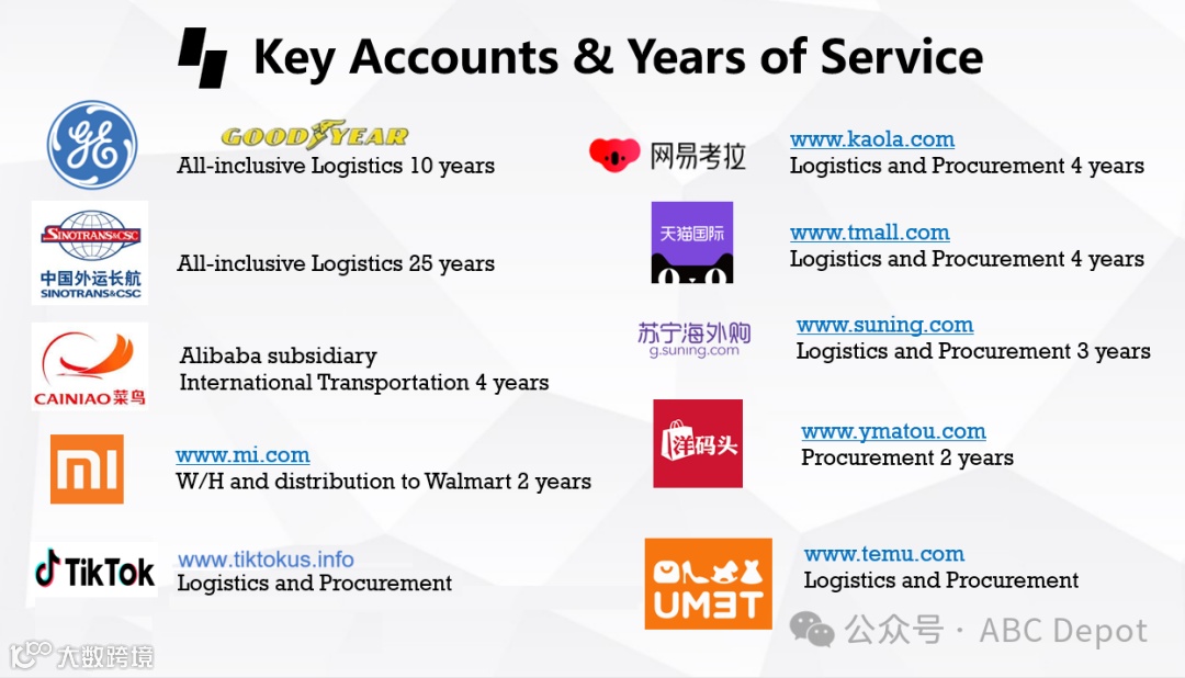 ABC Depot Logistics凭借多年的海空运干线运输、跨境物流服务经验,为全球电子商务客户提供北美销售和采购方案、海外仓平台管理、跨国运输、清关派送、亚马逊FBA等全程物流解决方案。