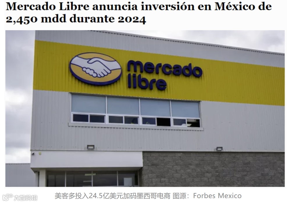 除了亚马逊之外,其他电商平台也在墨西哥市场加大了投资力度。例如,沃尔玛宣布在2024年向墨西哥投资约345亿比索(约合20亿美元),比上一年增长了19%;美客多也在墨西哥新建配送中心,并加大了物流投入,以期赢得更多的消费者。