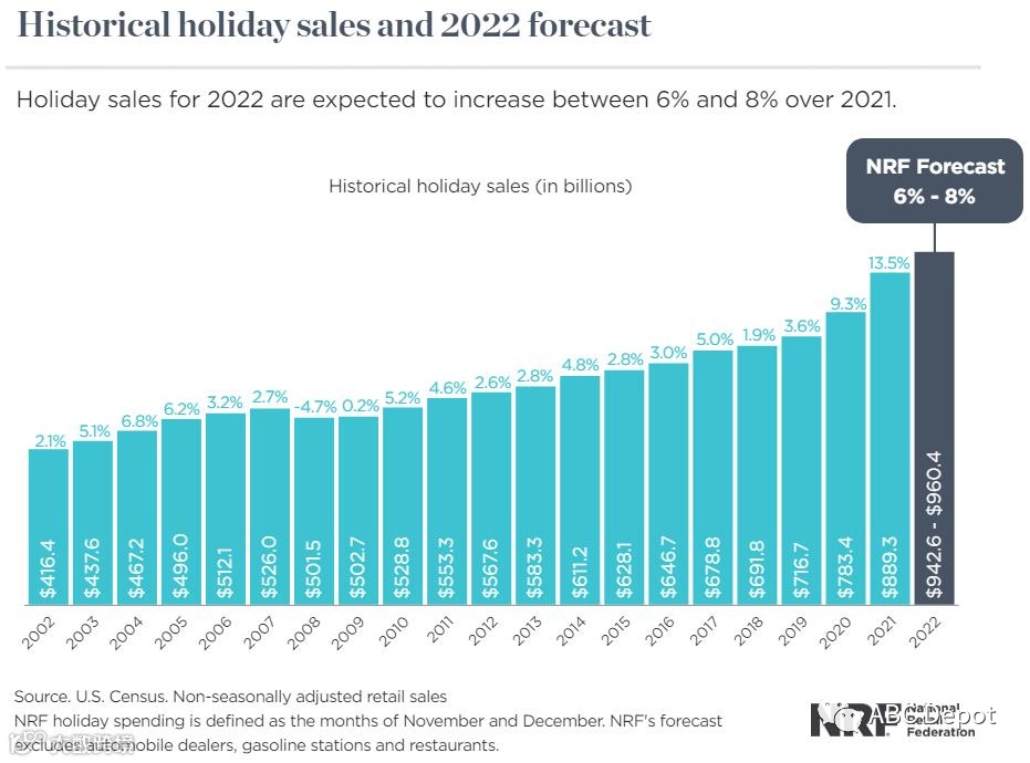 美国零售联合会(NRF)表示,尽管最近面临通货膨胀的挑战,假日消费仍有望保持健康。NRF预测11月和12月的假日零售销售额将比2021年增长6%至8%,达到9426亿至9604亿美元。去年的假日销售额比2020年增长了13.5%,达到8893亿美元。