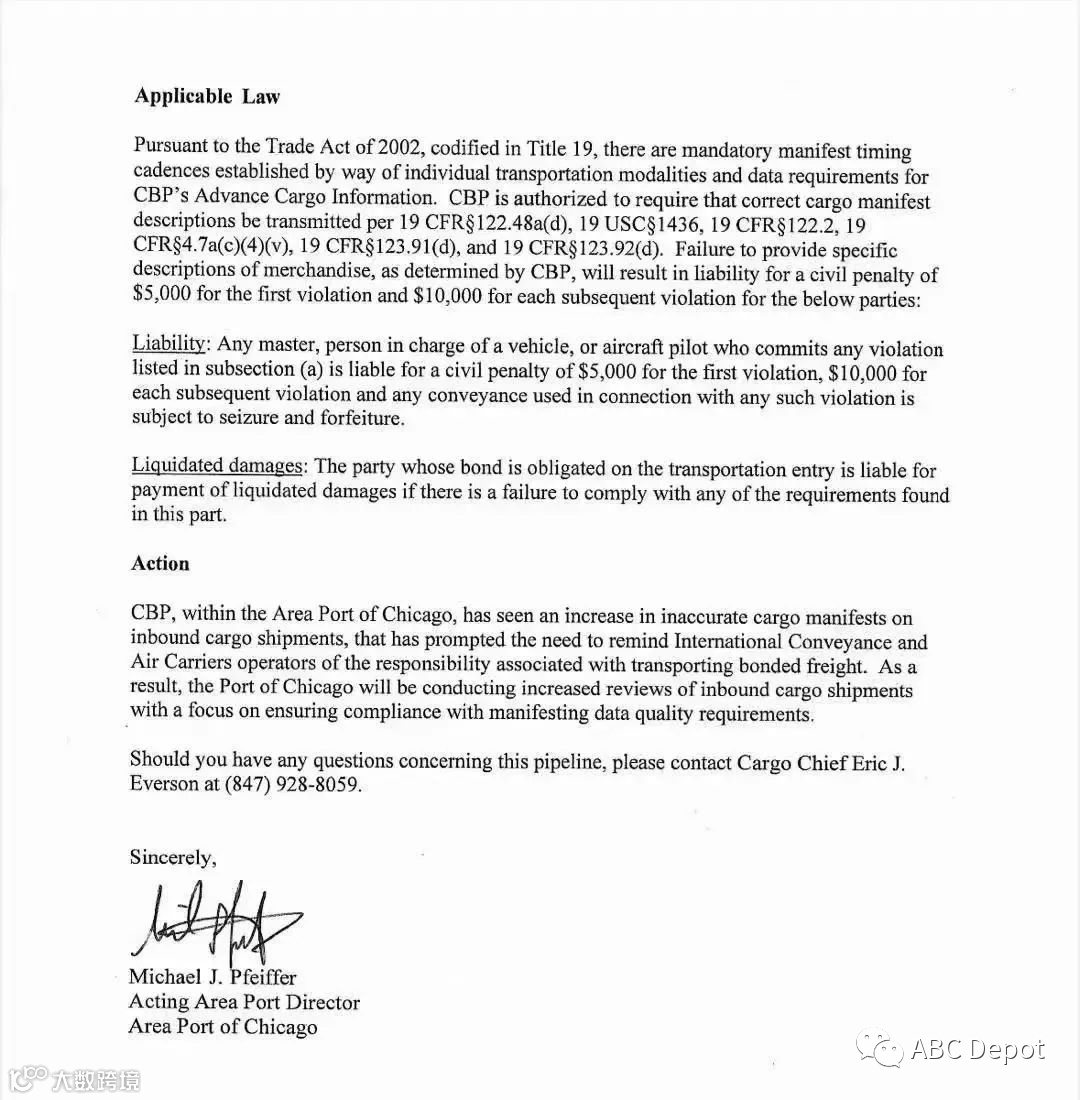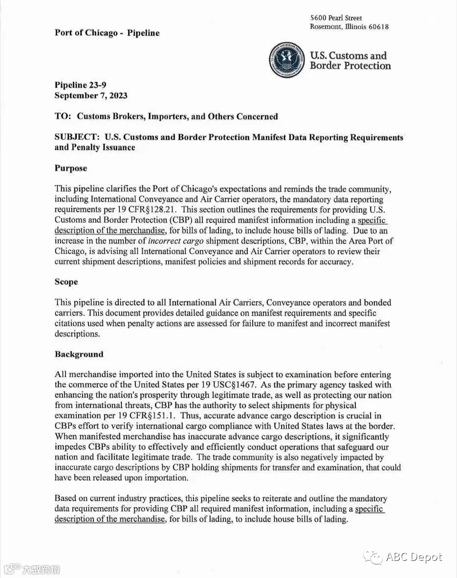 CBP官方公告中表示:“所有进口到美国的商品在进入美国商业之前都要根据19 USCS1467进行检查。美国海关边防总署是一个主要的组织,它的职责是透过正当的交易来推动一个国家的繁荣,并防止它受到国际上的威胁。它有权利按照第19条CFRS151条来挑选并检查商品。因此,准确的预先货物描述对于CBP在边境核实国际货物是否符合美国法律至关重要。”