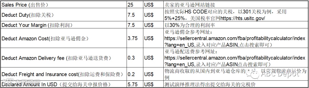 某天津LED生产企业E在美国亚马逊平台出售一批1000件灯具,平台售价为USD25,从厂家到美国港口的海运运输成本平均为USD0.2/个(含保险费),关税和杂税按照30%,平台佣金15%,平台配送费0.3/个,估计利润为30%,由此该企业要按照如下数据向美国海关申报: