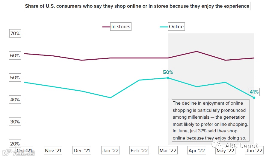 美国网上购物的乐趣正在减少,而商店却保持稳定,因为产品可视化。3 月份,50% 的在线购物者表示他们更喜欢在线购物,但是6月份,这一比例降至41%。随着消费者因通货膨胀而谨慎支配自己购买力,购物乐趣已经不像以前那样了。 店内购物也略有下降,但程度要小得多。