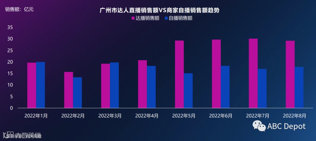 抖音直播电商趋势,广州市抖音达人直播销售额贡献整体高于商家自播销售额。达人直播销售额在2022年5月迎来较大增幅,商家自播销售额趋势比较稳定。