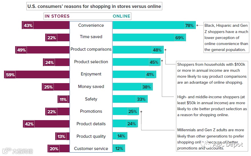 电子商务在便利性和节省时间方面胜过店内购物,在美国,网上购物在便利性、节省时间和产品选择方面——这些都是实体商店难以与之竞争的因素。
