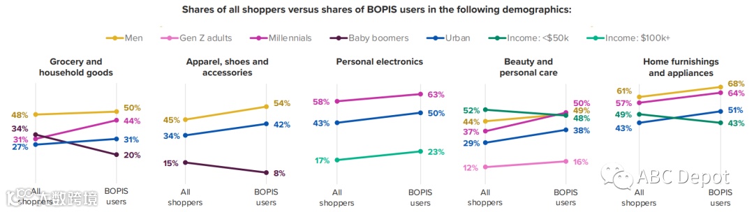 总体而言,城市购物者比郊区和农村购物者更多地使用BOPIS(Buy Online Pick Up In Store),这应该引起零售商在重新部署店面地点和面积以更好地满足BOPIS订单。以下所有购物者与网购店内提货的情况展示: