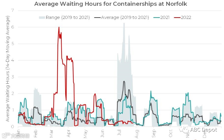 上图所示,诺福克港集装箱船的平均等待时间在近些年的历史上很少超过6小时,目前似乎没有。这四个拥挤的码头是美国东海岸最繁忙的码头,可容纳更大的船舶,包括最大类型的超大型集装箱船(ULCVs)。但是在6个不怎么拥挤的码头中今年也居然处理了超大型船只。