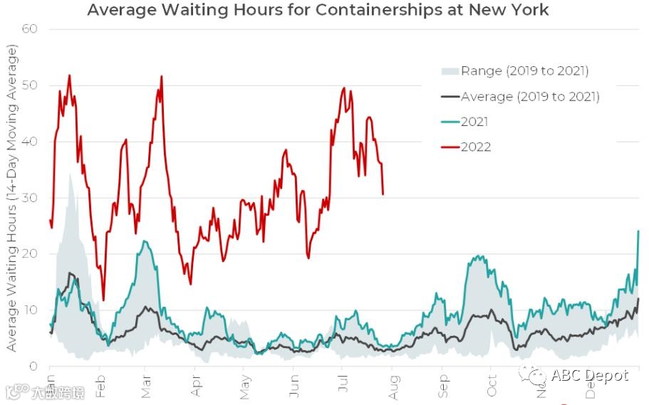 上图所示,在今年的大部分时间里,纽约港的平均等待时间在20到50小时之间波动。它远高于去年水平,去年基本不超过20小时,而且去年平均值几乎不超过10小时。