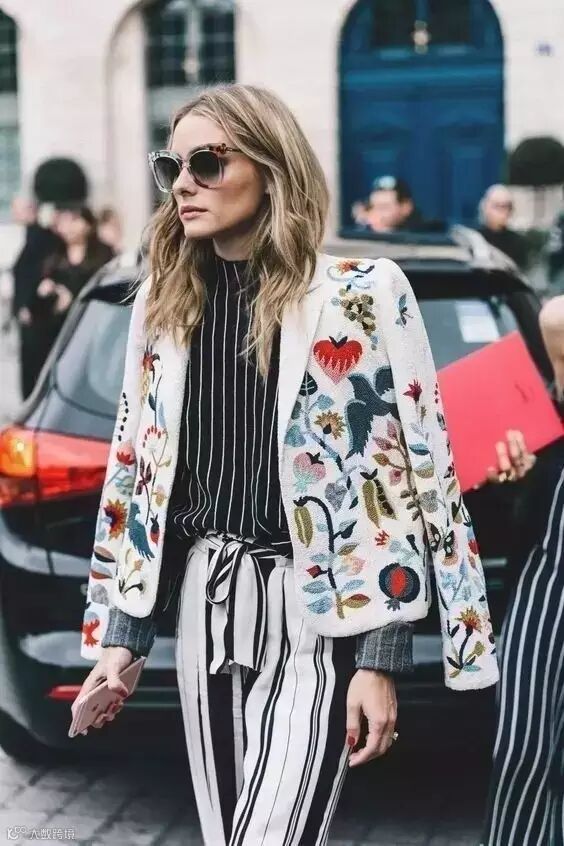 大胆一些的,还可以穿一件满是印花的外套,奥利维亚的印花西服外套,打破了西服的刻板和无聊。