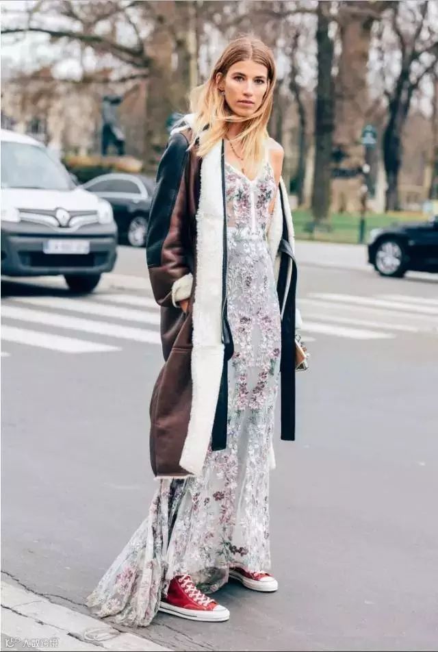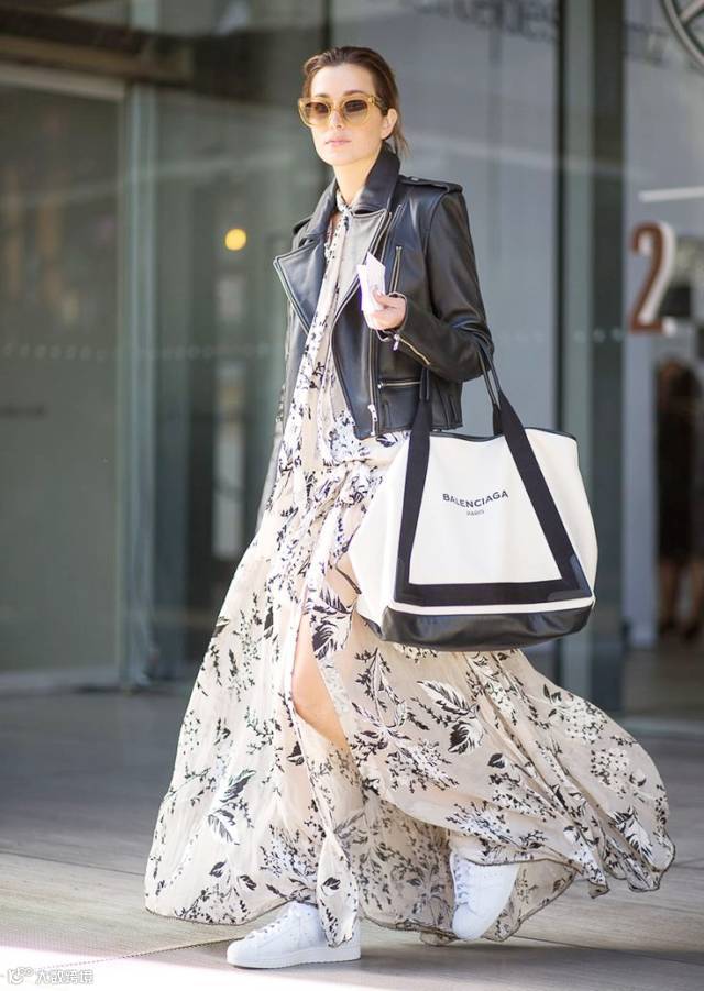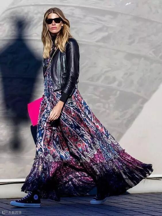 帅气的机车皮衣搭配印花连衣长裙,脚上配上运动鞋,穿出休闲时髦的娘man风~